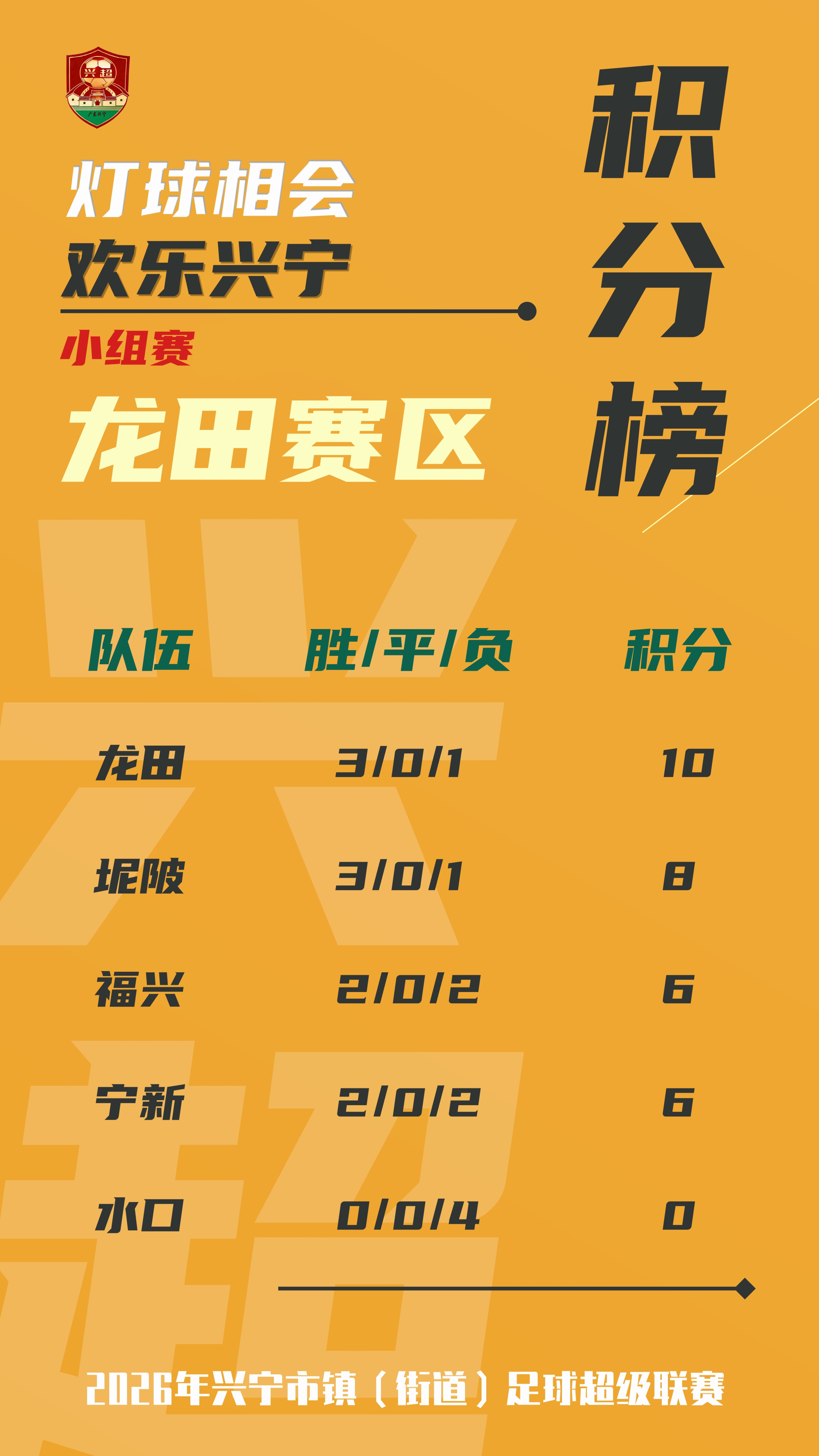 经过5轮的小组赛鏖战,“兴超联赛”小组赛八强席位正式落定,他们分别是龙田赛区:龙田镇队、坭陂镇队;黄陂赛区:石马镇队、黄陂镇队;新圩赛区:新圩镇队、刁坊镇队;叶塘赛区:新陂镇队、叶塘镇队。